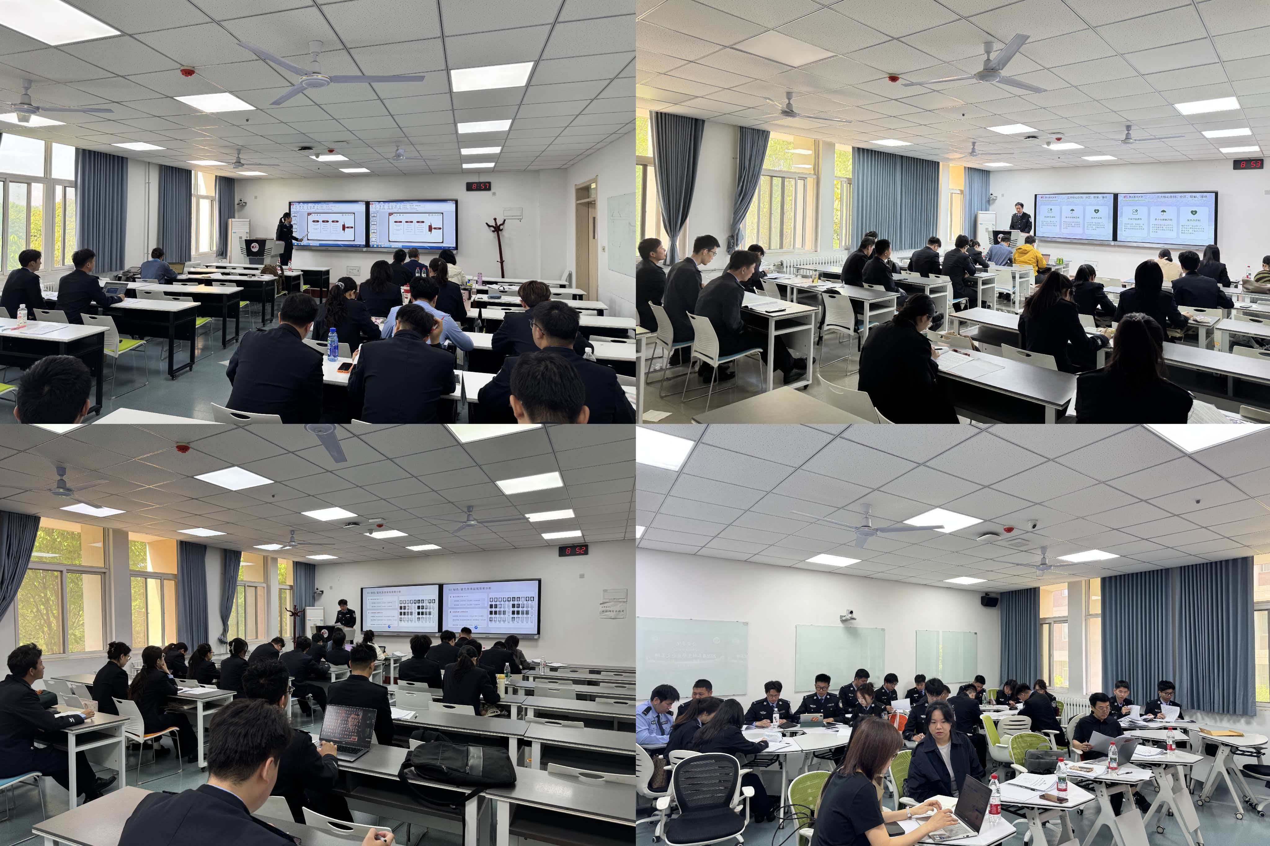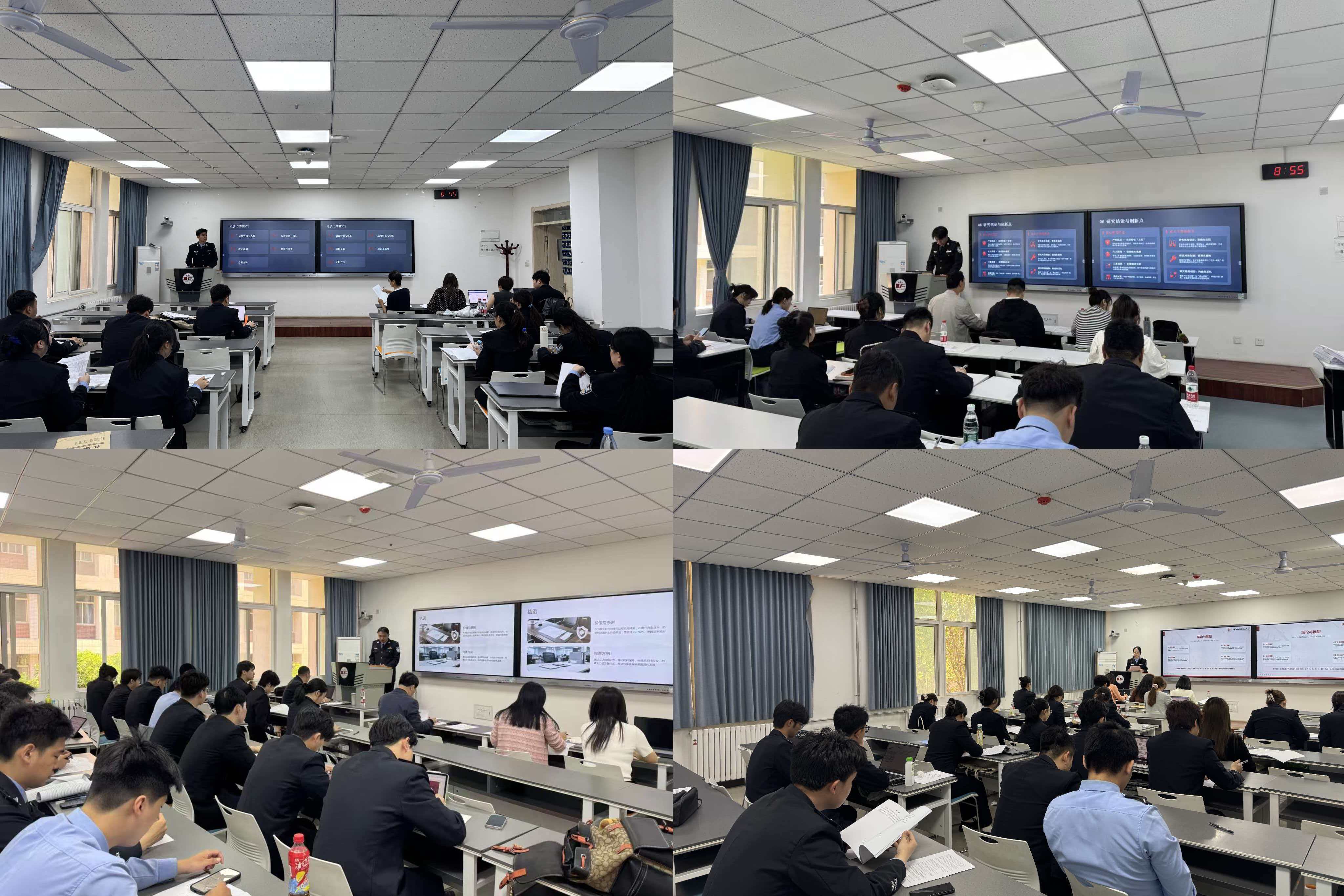 答辩现场秩序井然,学生统一身着警服,依次就论文的选题意义、研究方法、核心观点与创新之处进行陈述。答辩评委针对论文内容提出问题并给出修改建议,学生应答思路清晰,与评委进行了有效的学术互动。整个答辩过程采用线上系统进行记录和管理,保证了流程的规范与高效。